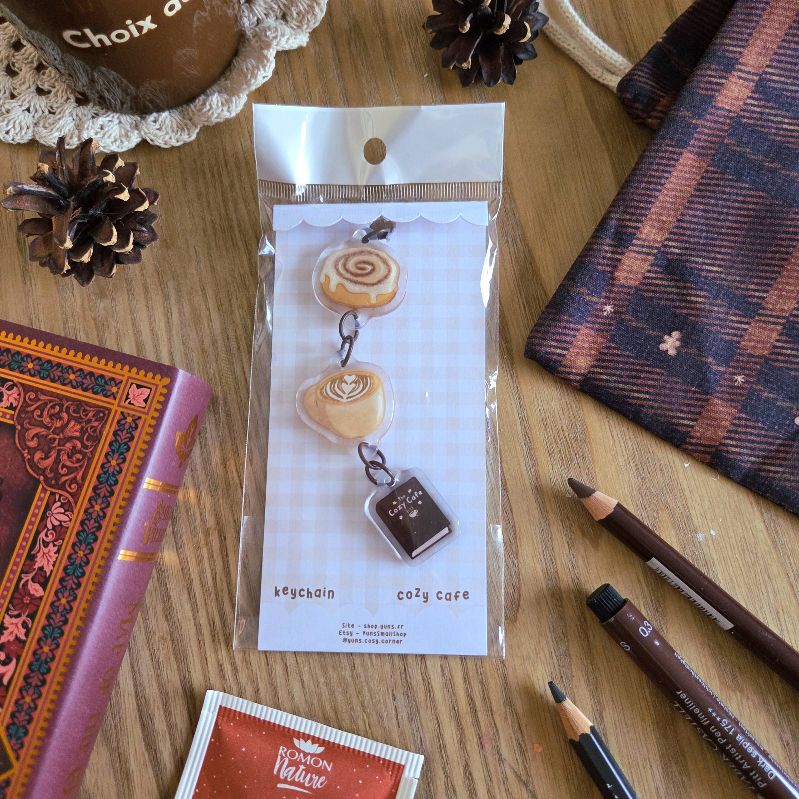 Ce porte-clé est composé de 3 petites breloques en plastique epoxy double face, soigneusement assemblées autour d’un thème chaleureux :