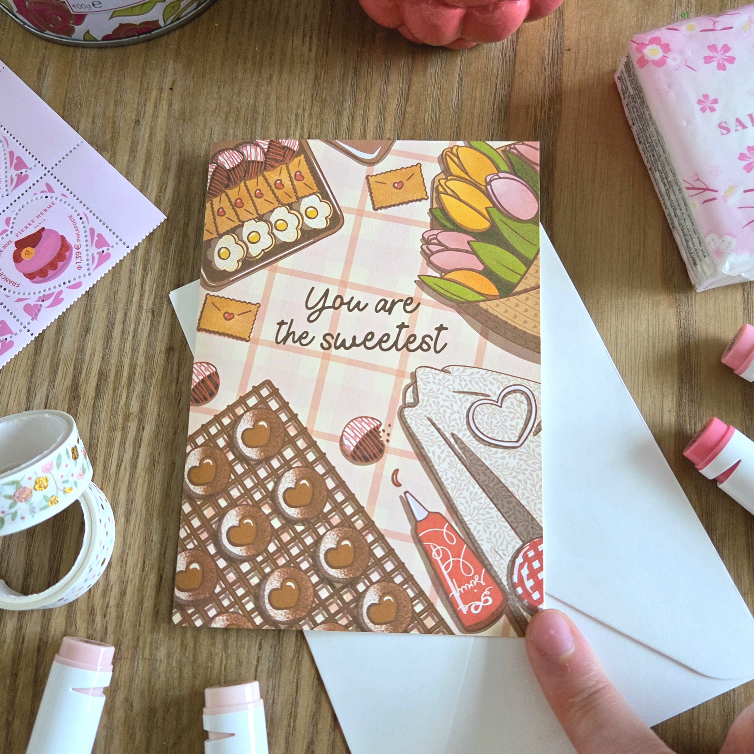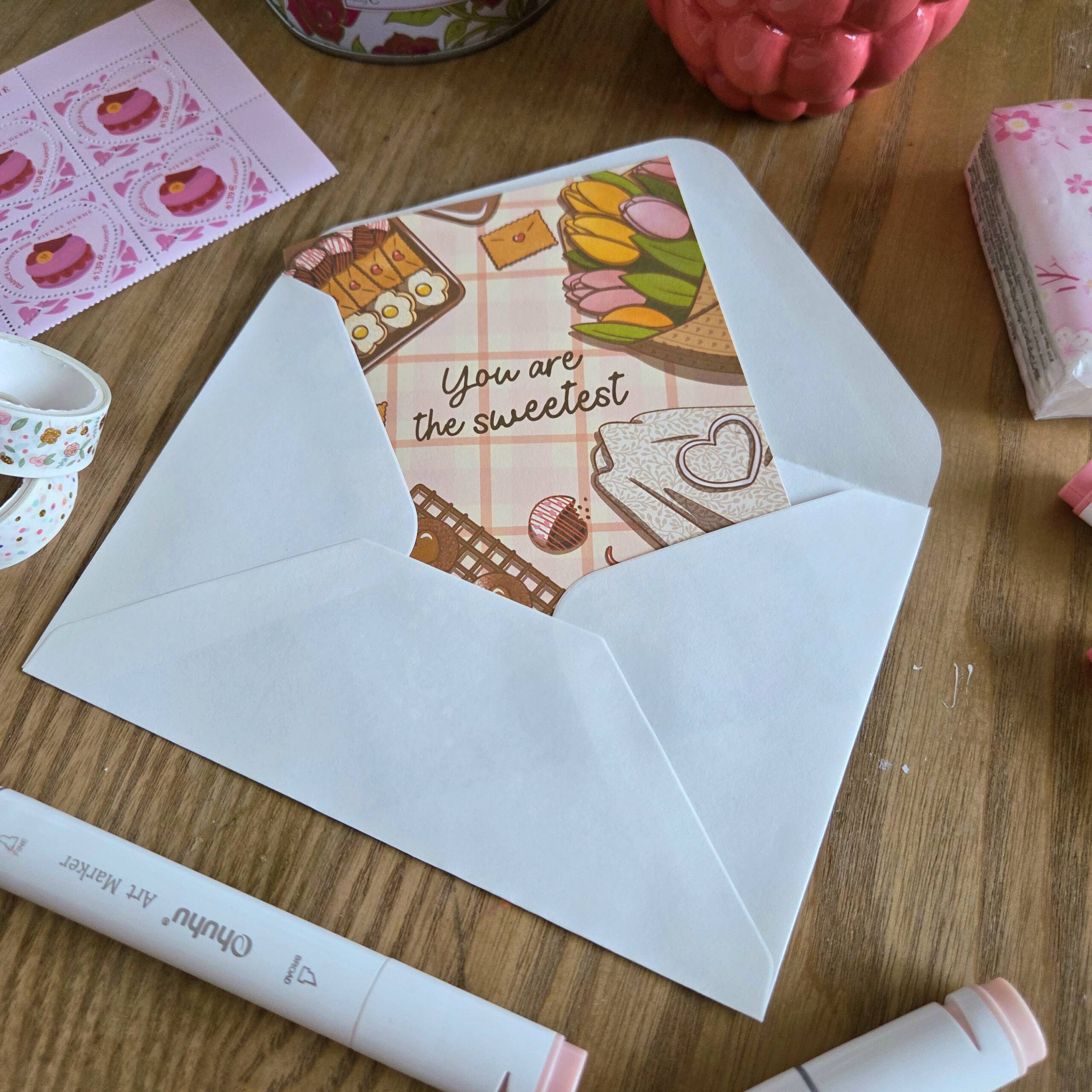Cette carte de vœux pliée est livrée avec son enveloppe, prête à être offerte ou envoyée. Son illustration cosy et gourmande convient aussi bien pour un·e partenaire, un·e amoureux·se, ou même une personne chère à votre cœur.
