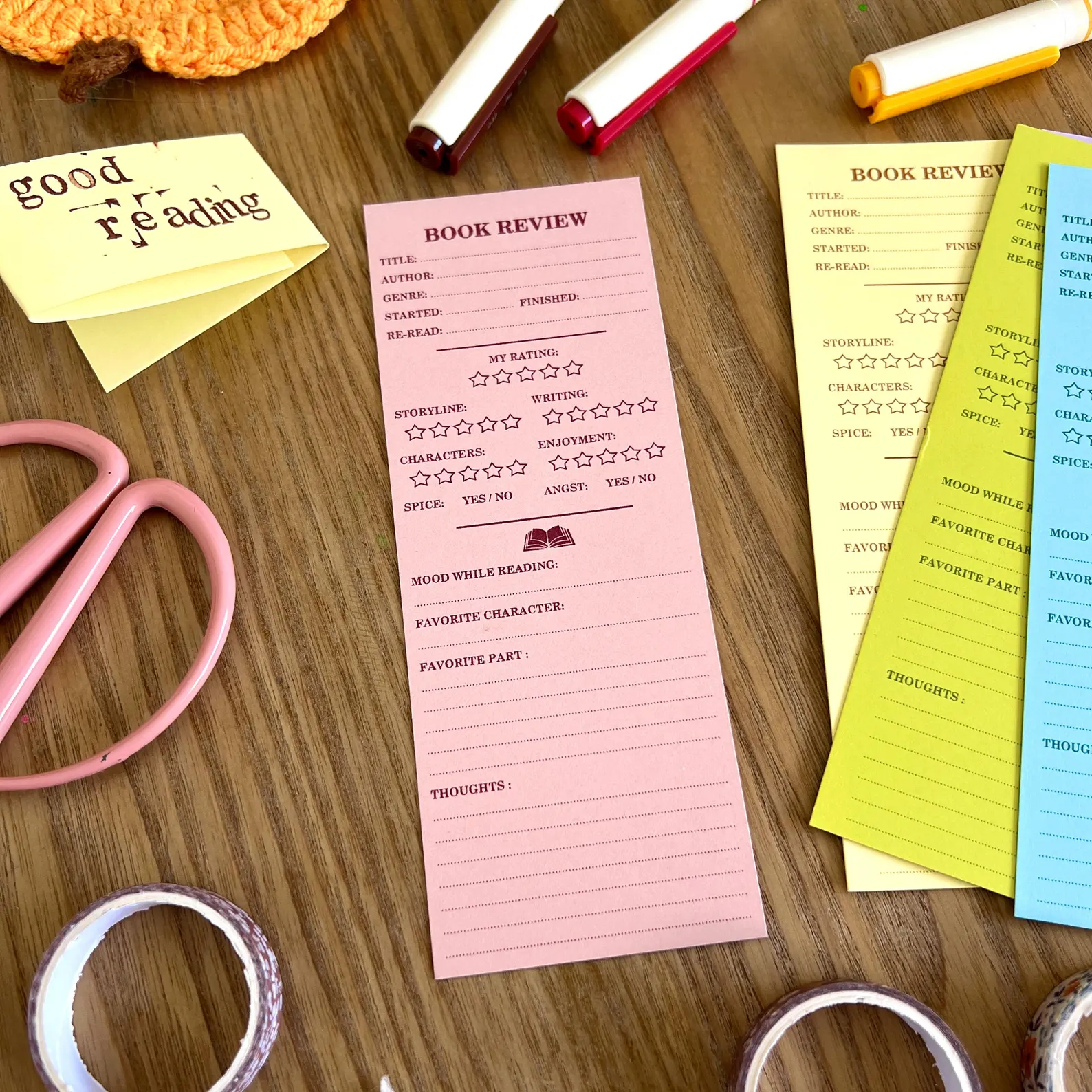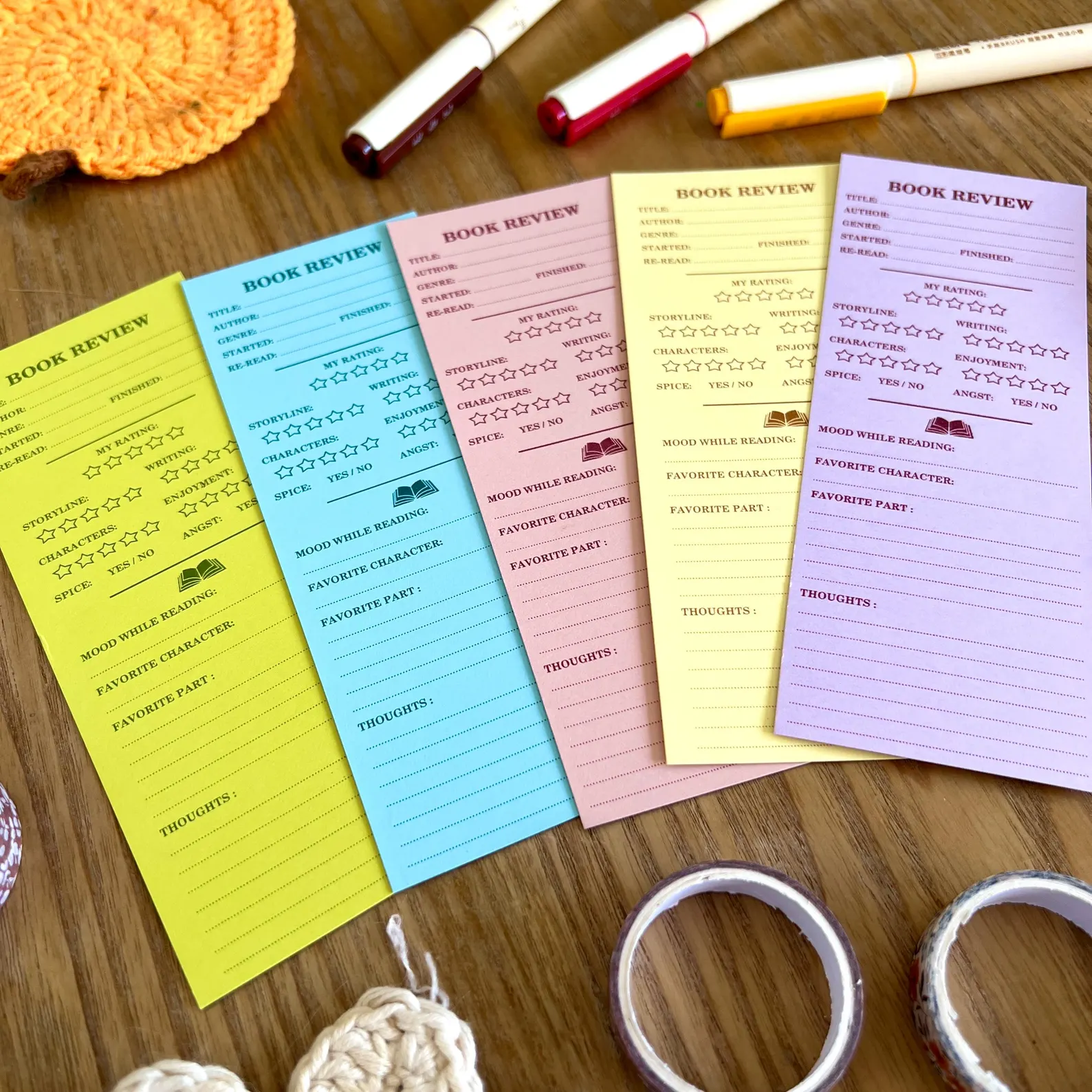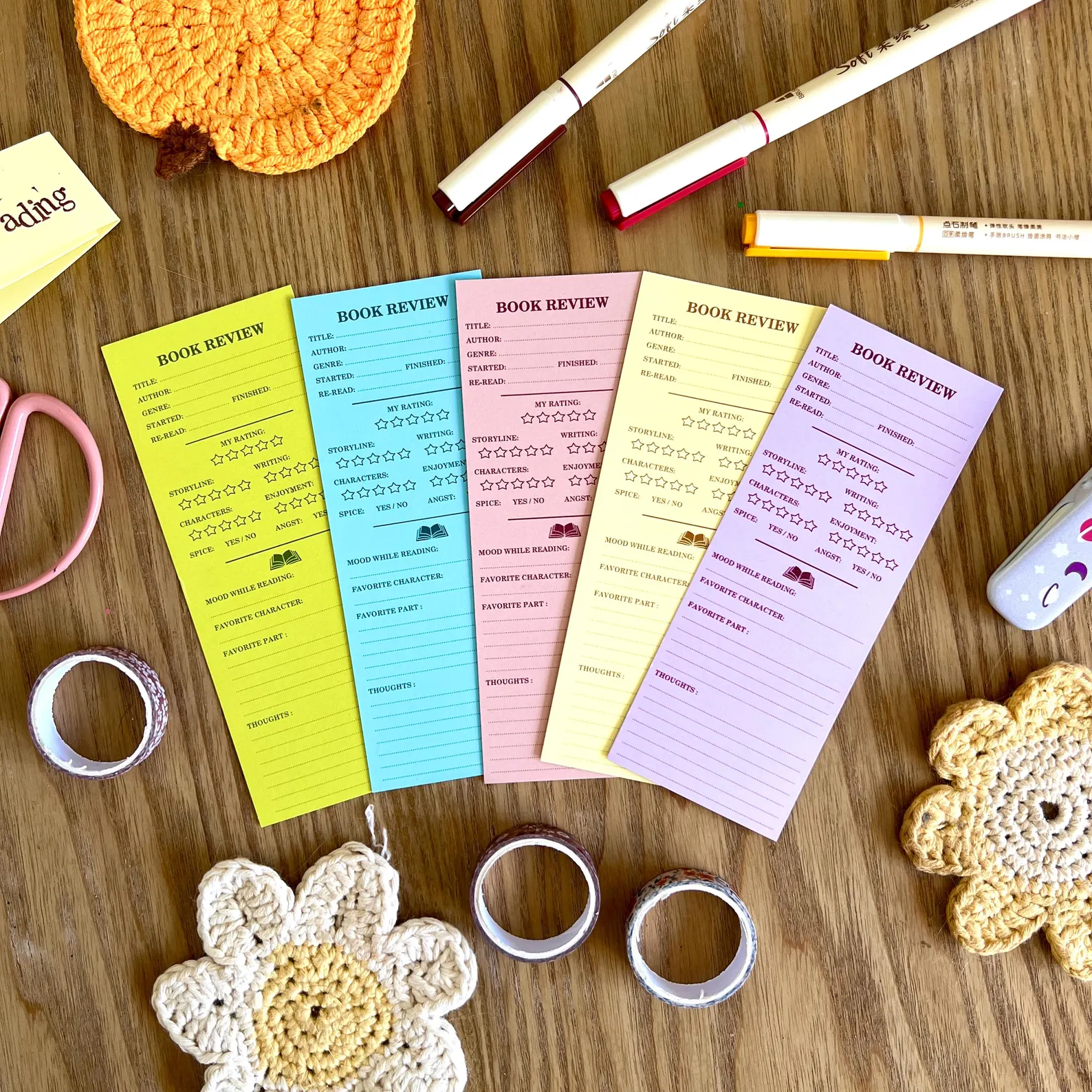 Gardez une trace de vos lectures préférées tout en ajoutant une touche de couleur à vos livres grâce à ce lot de 5 marque-pages « Book Reviews », l’accessoire idéal pour les lecteurs passionnés.